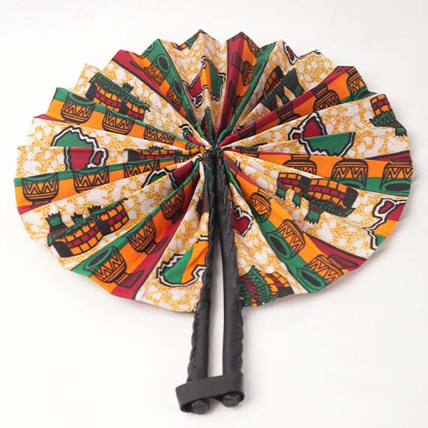 Made from vibrant African wax fabric, this fan is perfect for keeping cool while adding a touch of culture to your outfit.