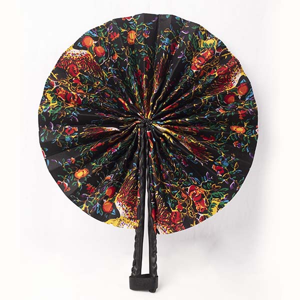 The Handcrafted African Wax Fan is made from high-quality African wax fabric with a durable handle.