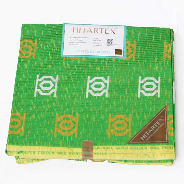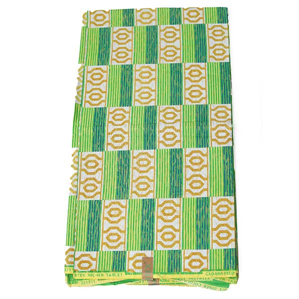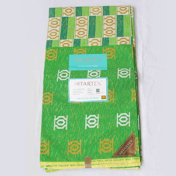 The Hitarex Green Fabric with Kente Prints for Sale elevates every garment you’ve created with its lush, vibrant kente patterns standing out beautifully.