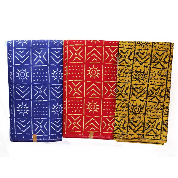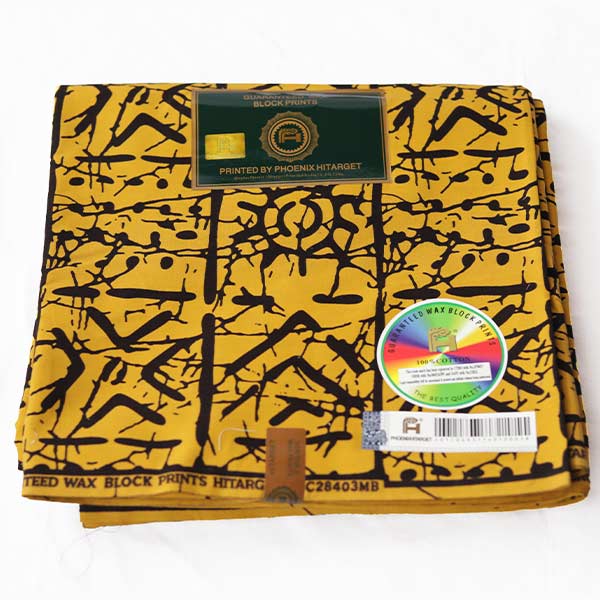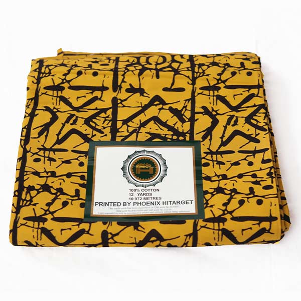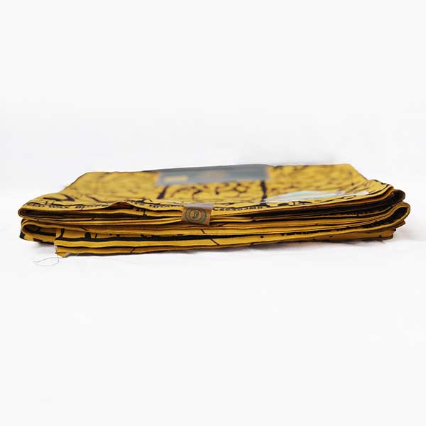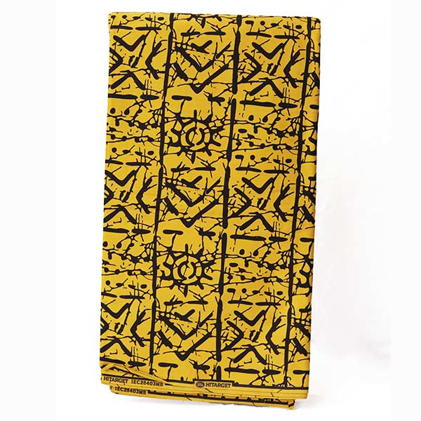 - Vibrant mustard yellow fabric with black ethnic motifs