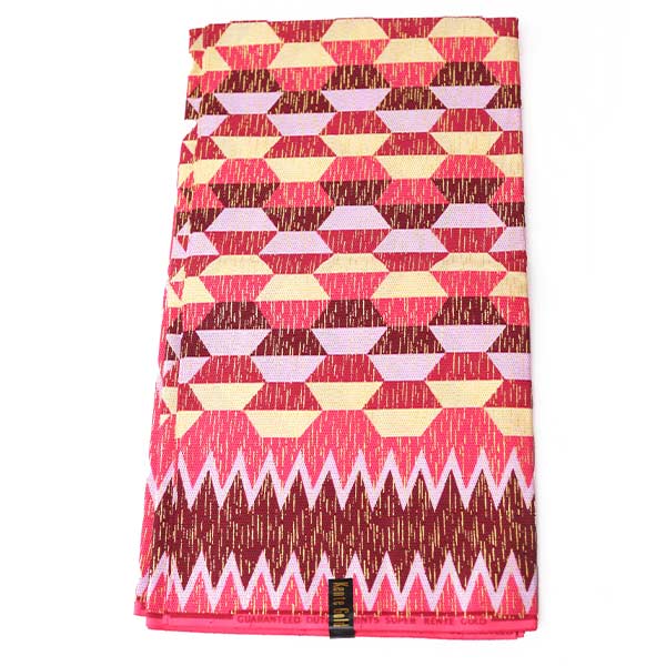 This exquisite fabric features a stunning blend of gold and pink hues, inspired by the iconic Kente patterns of West Africa.