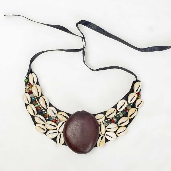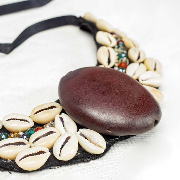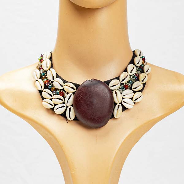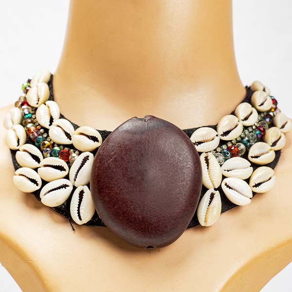 • Handcrafted African necklace featuring a central brown shell
