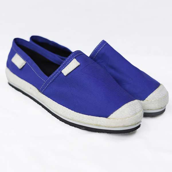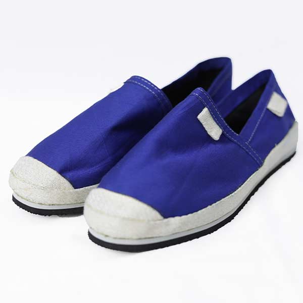 It is crafted with blue gabardine fabric, white woven webbing, and a durable rubber sole.