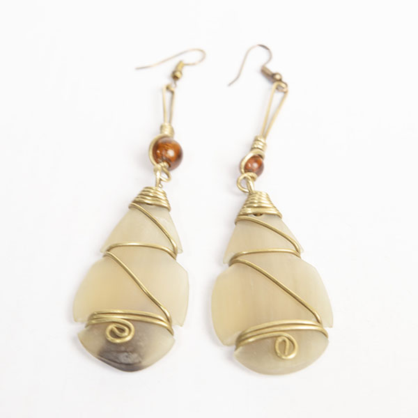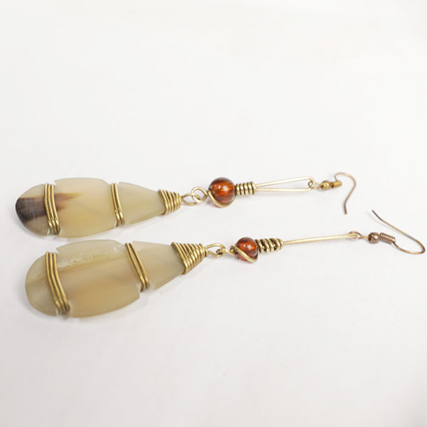 These earrings are handcrafted from natural ox horn and decorated with brown beads and bronze for an elegant finish.