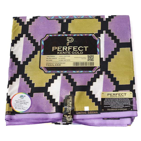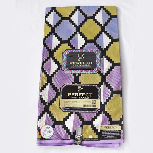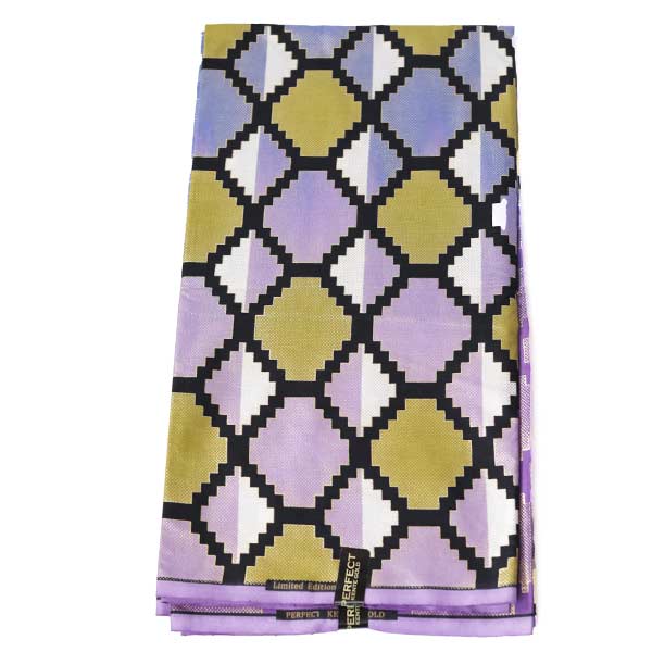 The Toned Purple Wax Kente Gold Fabric for Sale makes every outfit you sew pop with its cool purple and gold prints grabbing attention fast.