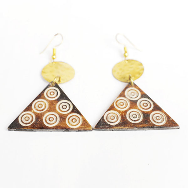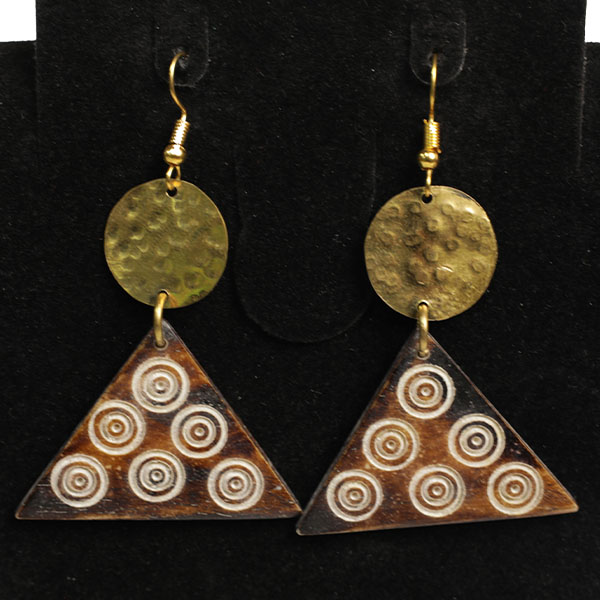 Add a unique flair to your accessory collection with these Triangle Ox Horn Earrings with Bronze Circles.