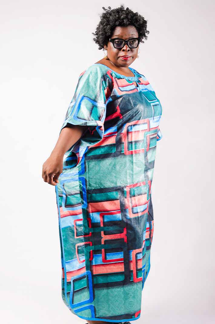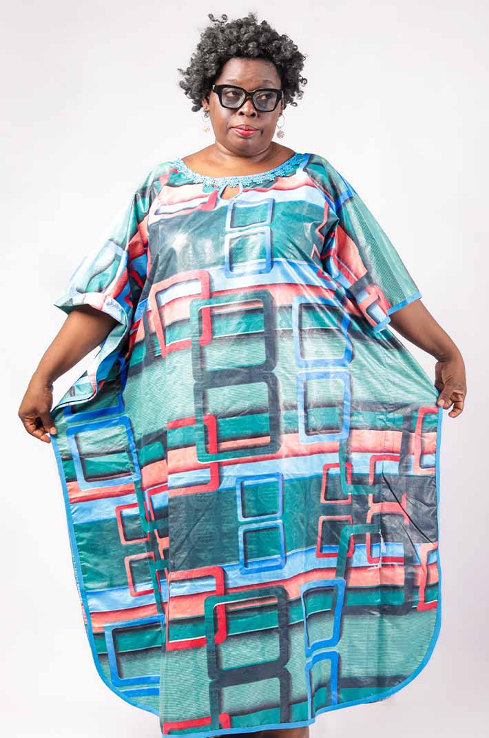 The Women Blue Boubou with Geometric Patterns is a beautiful fusion of traditional African patterns and contemporary fashion, offering both comfort and style.